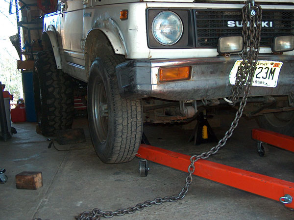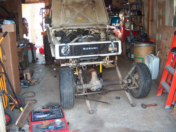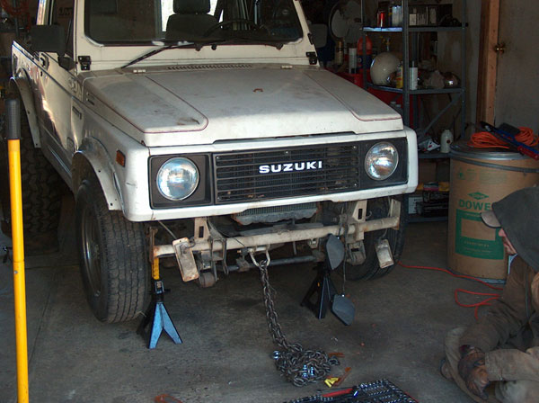 | Yesterday i picked up my 'new' front axle for the samurai. Its from an '85 toy pickup....i had it out getting regeared (5.29) with a lockright. So today we spent the day pulling the front-end apart. Pulled the shocks, disconnected the brakes, and unbolted the springs! The tierod (or is it draglink? i can never remember that) didnt want to seperate from the pitman arm, so we just hacked it off near the end with the torch. Wont be needing that anymore anyway! |