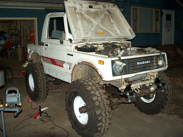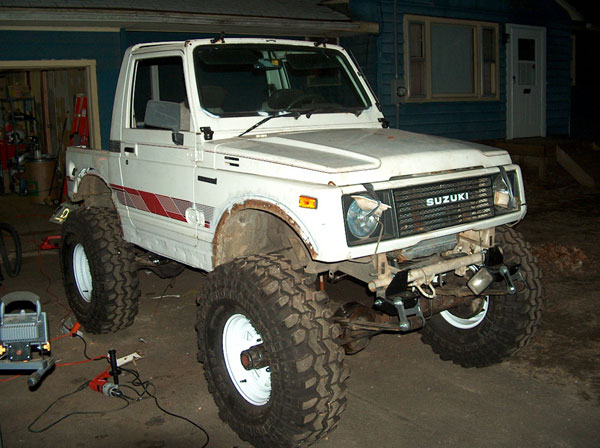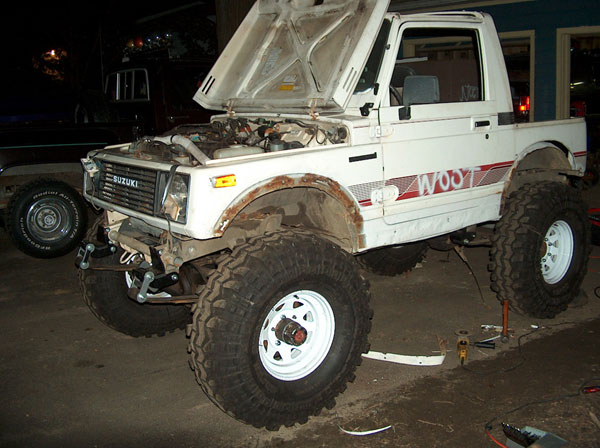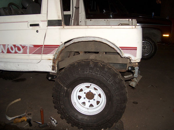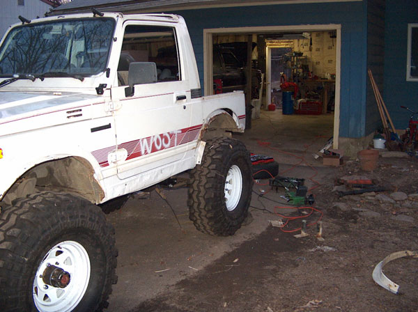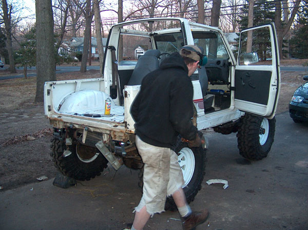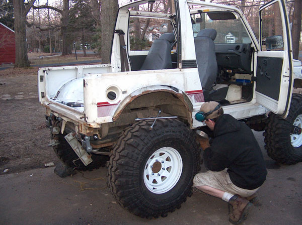 today was a pretty constructive day. Or should i say destructive? Today we began phase two in stripping down the zuk. Finally got the damned tailgate off (blasted lock-tite), removed the crappy OEM sport cage, and starting hacking the fenders up. Tomorrow theyll get painted, but they wont be finished till after i can get it flexed out to see how much more sheetmetal needs to be removed. I even had to cut the tub xmember in the front where the front bumper bolts, cause you couldnt turn the wheels (almost at all!) without digging into the tread. The tires stick out like 6" on each side now! Im going to have to make fender flares to cover them at least partially. also, the in the first pic is a sneak peek at a few peices that came in the mail yesterday.....as to what theyre for...lll give ya a hint, the one on the right is an orbital valve! |