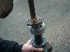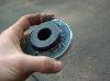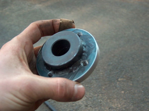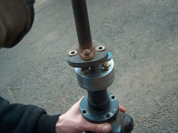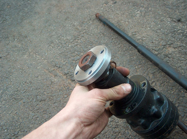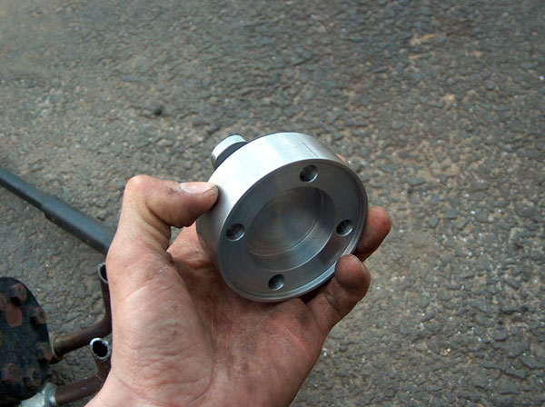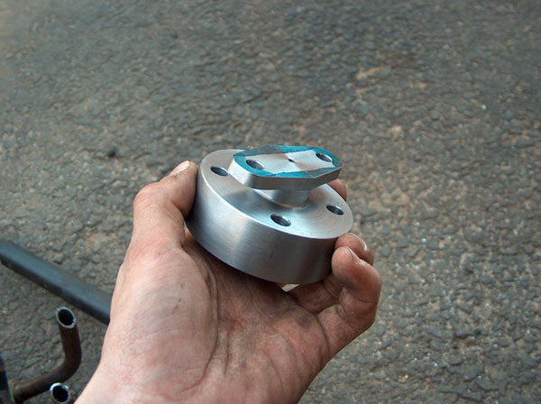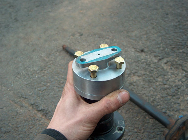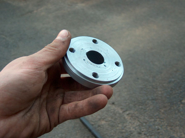 This is how we went about adapting the orbital valve to the steernig shaft. In the first two pic is the splined part of the john deere steering wheel with a plate machined, welded and then machined again onto it. the third pic show it mounted on the valve. The fourth and fifth pictures show the 'adapter plate'. This bolts to the splined piece on the orbital valve, and also to the steering shaft. The last couple pics show how it all bolts together. |