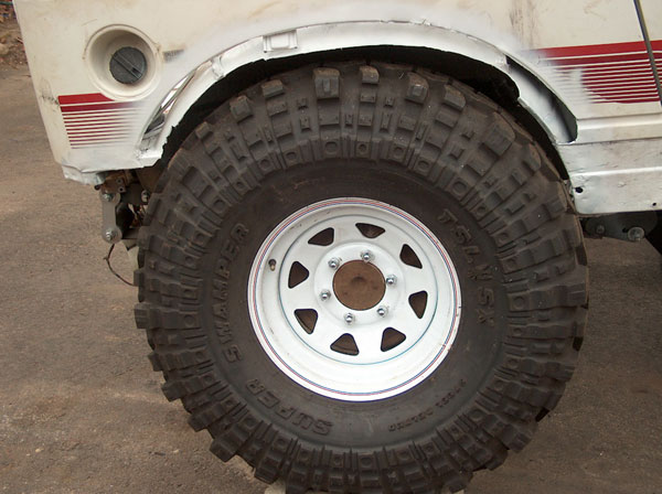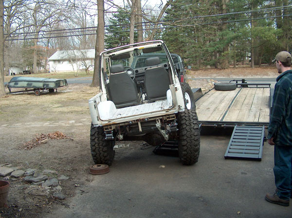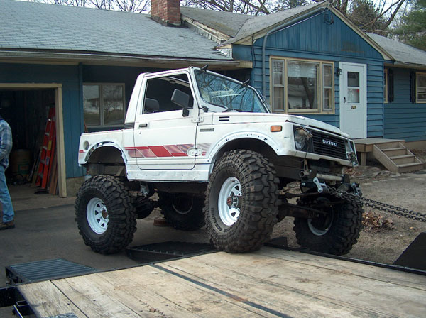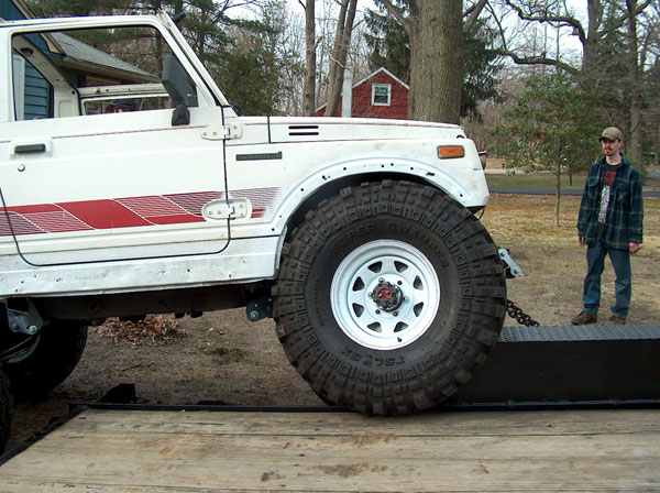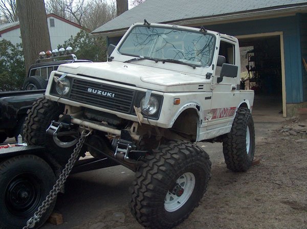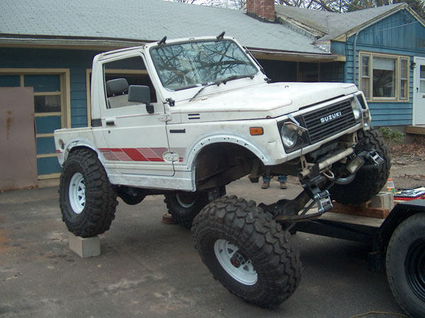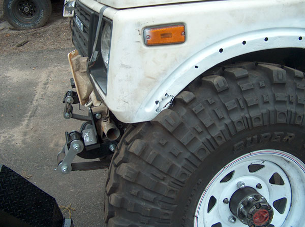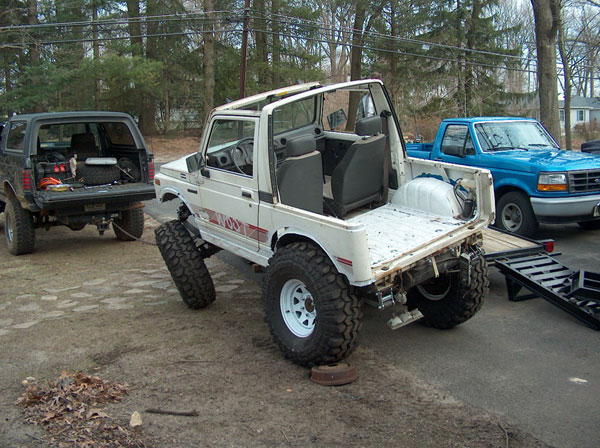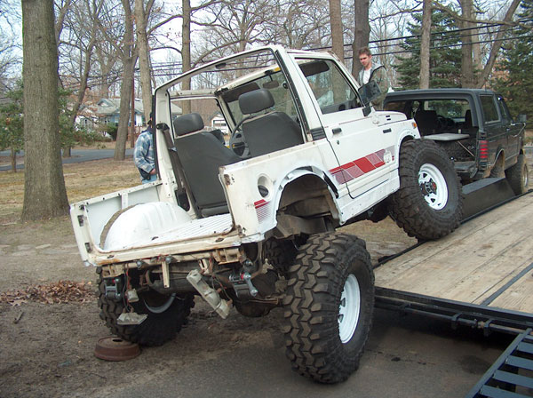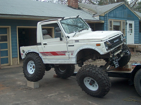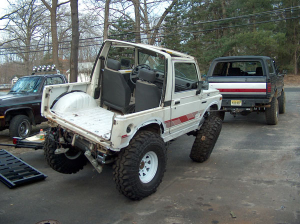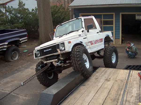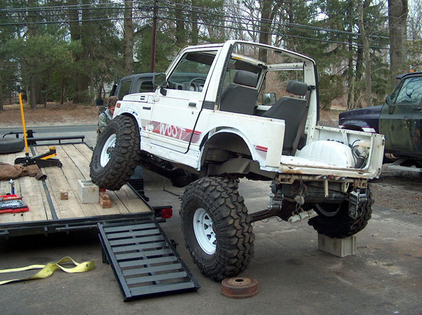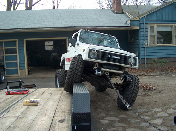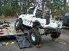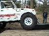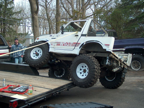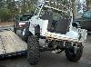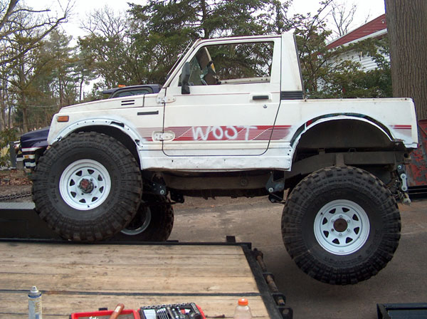 An experiment in suspension travel! This is the first real 'test' of the suspension. YJ springs are really soft! Even with the light weight of the zuk, the springs will still flex all the way into a negative arch. We tried a few times to compress and flex both sides of the zuk, so i could measure for driveshafts. We came closer to the maximum travel in the rear than we did in the front; the front fenders need to be opened up alot. It wouldnt fully compress because the fender was sticking right into the tire. Partially because of that, we couldnt get the missing links on the opposite tire to fully open up, so there is still a little more droop to be had. |