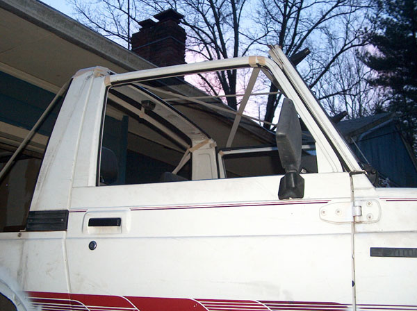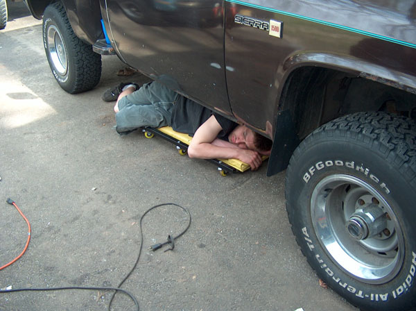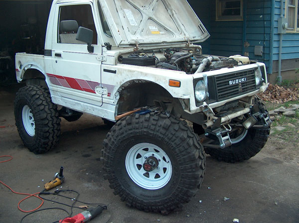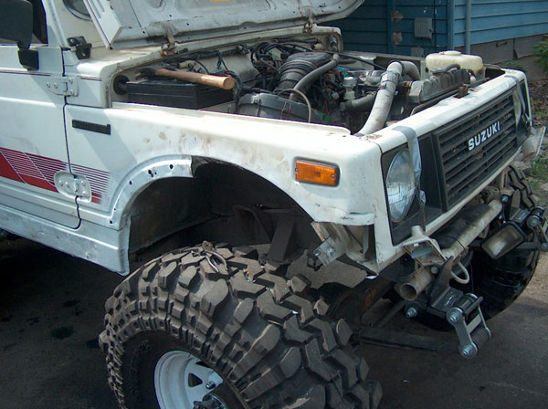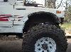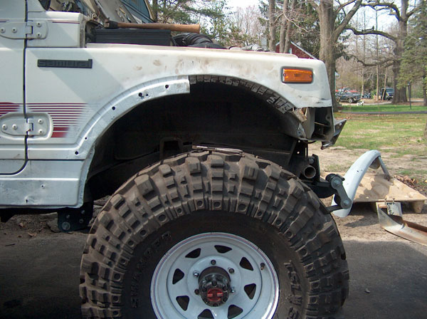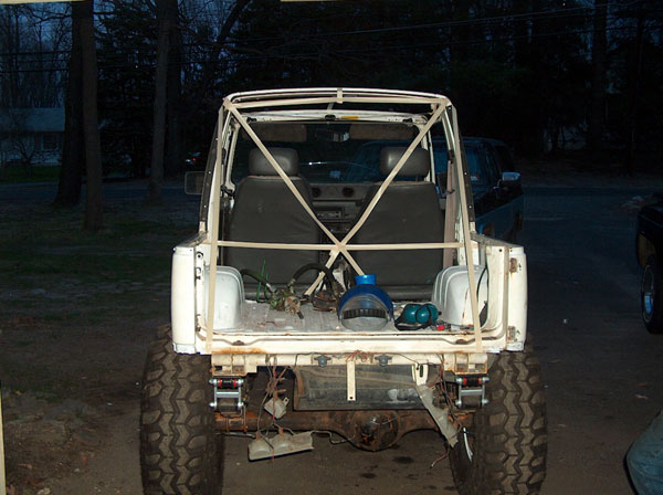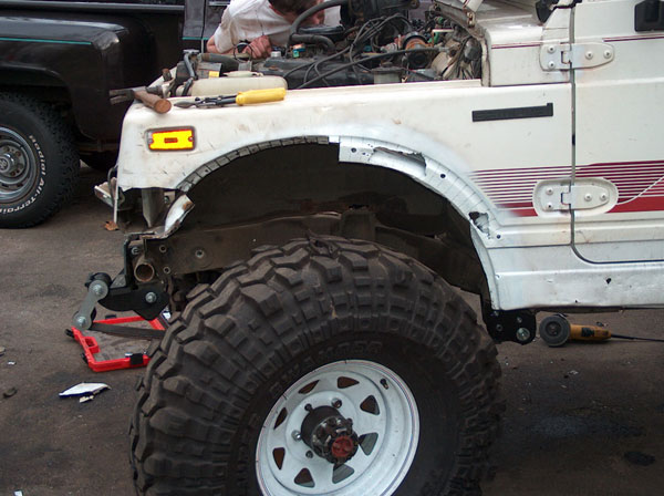 Today we started working on the front fenders. They tires just dont fit, so we had to chop a couple inches out of them to open em up a bit. In order to be able to close the fenders back off afterwards (to retain a stock appearance), we cut slits 1" apart from each other right up the fender panel and fenderwell, and then seperated the two. Then, bent the fenderwell up, and bent the fender back into the well. Next up will be to drill a pilot hole thru both tangs, and use poprivets to hold them together. Eventually, ill finish off the inside of the well to close up the smaller gaps, and will be installing some form of fenderflare around the opening to give it a more finished appearance. the last couple pics are mockups with masking tape to give us an idea of how the cage will be built. |